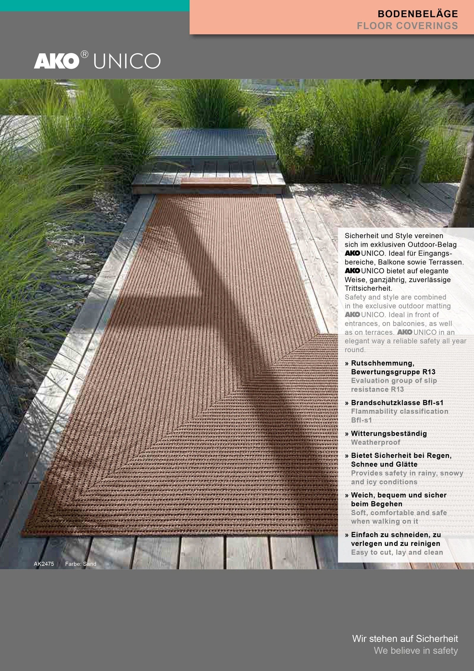 - Die AKO Sicherheitsmatte wurden speziell für Außenbereiche entwickelt: Rutschsicher (R13) - Gegen Wasser, Kälte und Wärme unempfindlich - Dünne Eisschicht zerbricht beim Auftreten, Rutschsicherheit bleibt bestehen - Verrottungsfest und UV-Beständig - Einfach zu schneiden, zu verlegen und zu reinigen