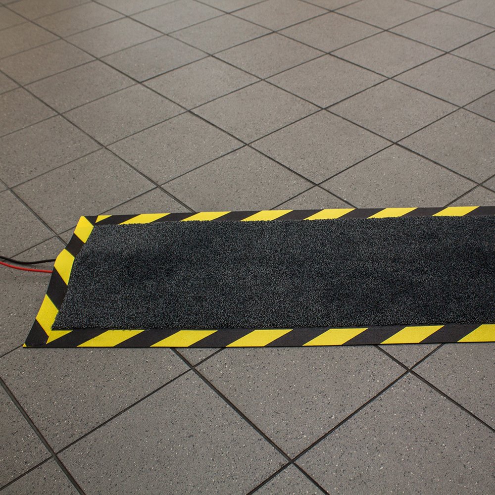 - Ränder der Kabelschutzmatte mit Warnmarkierung.