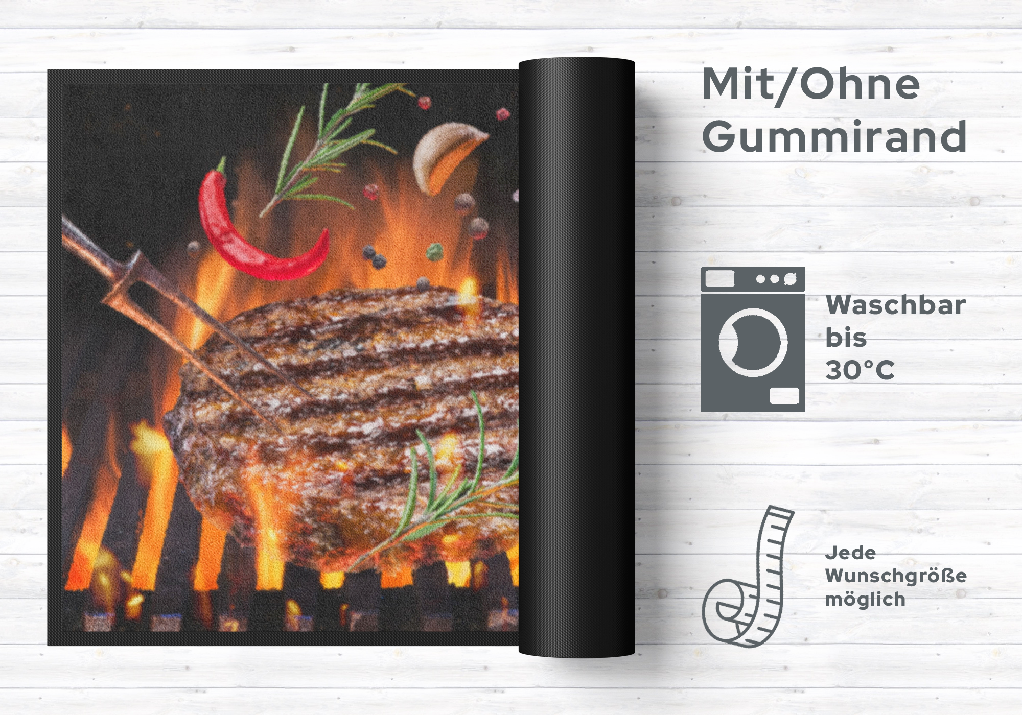 Mit dieser Fussmatte Steak 6361 zaubern Sie nicht nur Ihren Besuchern ein Lächeln ins Gesicht. Diese sehr hochwertige Fussmatte ist reissfest, knitterfrei, waschbar. Da sie mit 7-8 mm Gesamthöhe sehr flach ist, passt sie unter fast jede Tür. Die Fussmatte ist Schadstoffgeprüft und für Allergiker geeignet. Sie erhalten 5 Jahre Herstellergarantie.