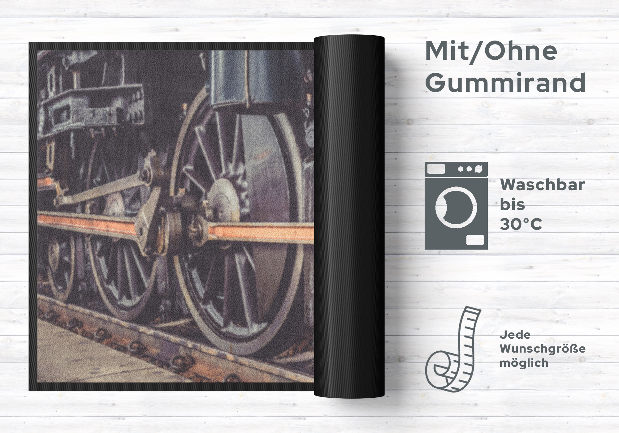 Pflegeinfo: Waschen Sie die Fussmatte Eisenbahn 6318 separat bei 40° Temperatur mit Feinwaschmittel, schleudern diese auf niedriger Stufe, dadurch richten sich die Fasern auf, der Mattenflor wird aktiviert und transportbedingte Falten und Knicke werden wieder glatt. Pflegen Sie so Ihre Fussmatte regelmäßig und Sie werden überrascht sein, wie viele Jahre Qualität und Farbe erhalten bleiben.