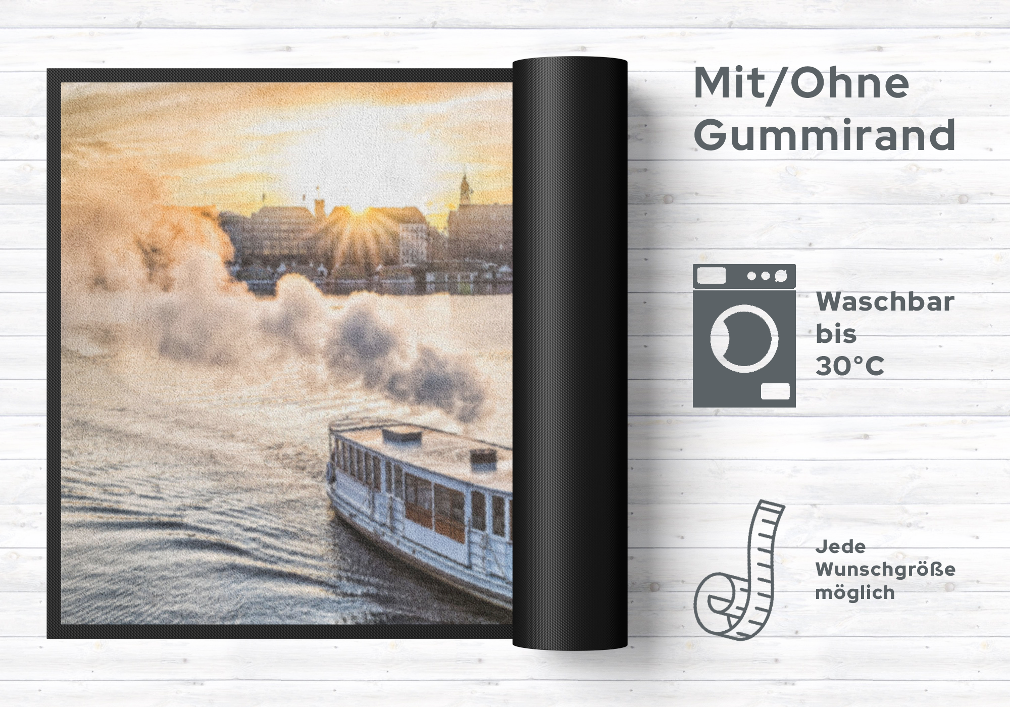 Mit dieser Fußmatte Hamburg 4493 zaubern Sie nicht nur Ihren Besuchern ein Lächeln ins Gesicht. Diese sehr hochwertige Türmatte ist reissfest, knitterfrei, waschbar. Da sie mit 7 mm Gesamthöhe sehr flach ist, passt sie unter fast jede Tür. Die Fußmatte ist Schadstoffgeprüft und für Allergiker geeignet. Sie erhalten 5 Jahre Herstellergarantie.