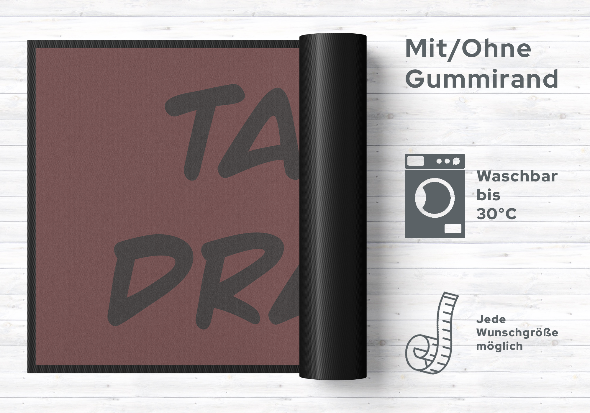 Pflegetipps: Waschen Sie die Fußmatte 10588 separat bei 40° Temperatur mit Feinwaschmittel, schleudern diese auf niedriger Stufe, dadurch richten sich die Fasern auf, der Mattenflor wird aktiviert und transportbedingte Falten und Knicke werden wieder glatt. Pflegen Sie so Ihre Fußmatte regelmäßig und Sie werden überrascht sein, wie viele Jahre Qualität und Farbe erhalten bleiben. Rückgaberecht ausgeschlossen, da es sich um eine individuelle Fussmatte handelt.