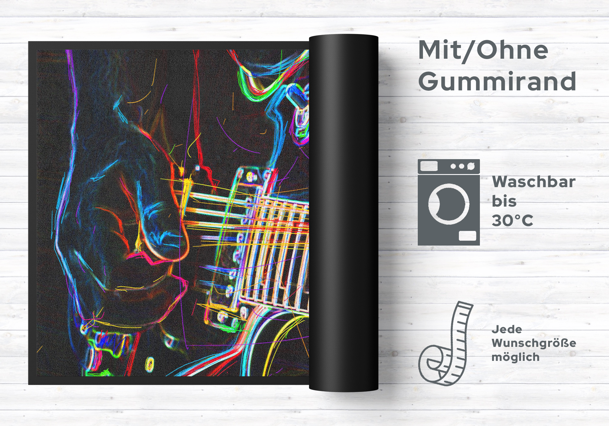 Mit dieser Fussmatte E-Gitarre 10255 zaubern Sie nicht nur Ihren Besuchern ein Lächeln ins Gesicht. Diese sehr hochwertige Türmatte ist reissfest, knitterfrei, waschbar. Da sie mit 7 mm Gesamthöhe sehr flach ist, passt sie unter fast jede Tür. Die Fussmatte ist Schadstoffgeprüft und für Allergiker geeignet. Sie erhalten 5 Jahre Herstellergarantie.