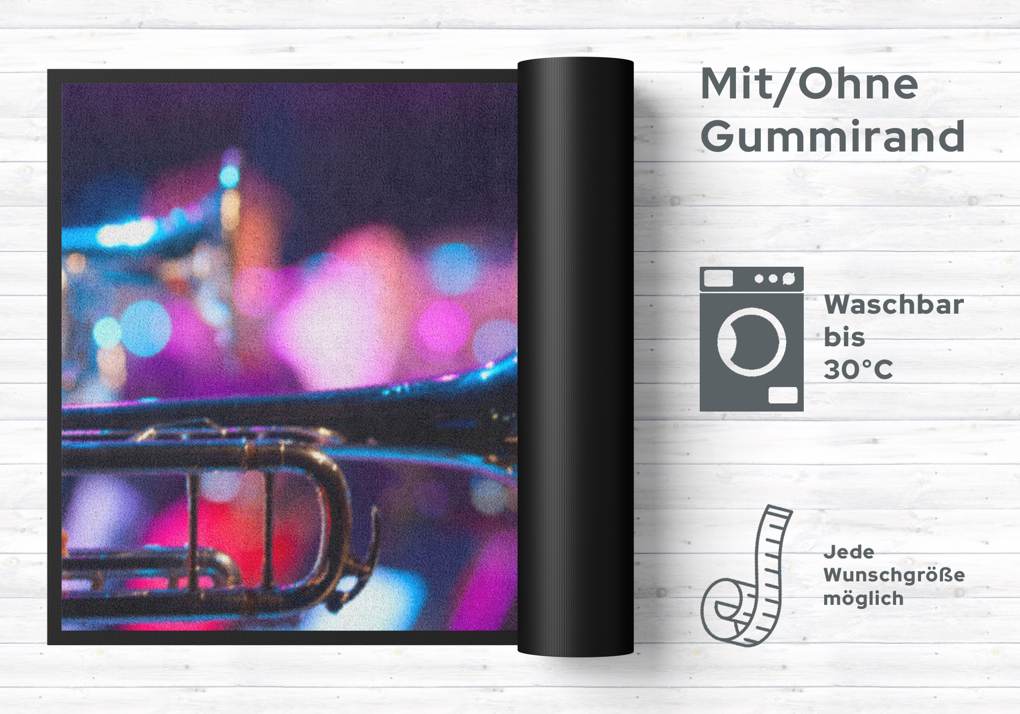 Mit dieser Fussmatte Trompete 6272 zaubern Sie nicht nur Ihren Besuchern ein Lächeln ins Gesicht. Diese sehr hochwertige Fussmatte ist reissfest, knitterfrei, waschbar. Da sie mit 7-8 mm Gesamthöhe sehr flach ist, passt sie unter fast jede Tür. Die Fussmatte ist Schadstoffgeprüft und für Allergiker geeignet. Sie erhalten 5 Jahre Herstellergarantie.