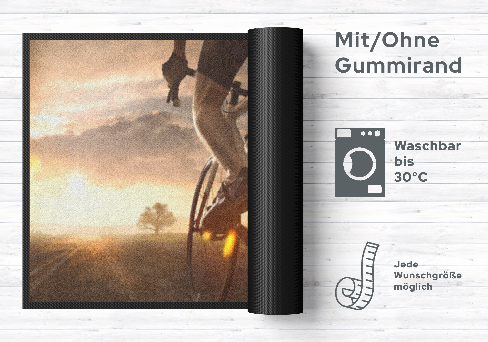 Mit dieser Fußmatte Rennrad 4591 zaubern Sie nicht nur Ihren Besuchern ein Lächeln ins Gesicht. Diese sehr hochwertige Türmatte ist reissfest, knitterfrei, waschbar. Da sie mit 7 mm Gesamthöhe sehr flach ist, passt sie unter fast jede Tür. Die Fußmatte ist Schadstoffgeprüft und für Allergiker geeignet. Sie erhalten 5 Jahre Herstellergarantie.