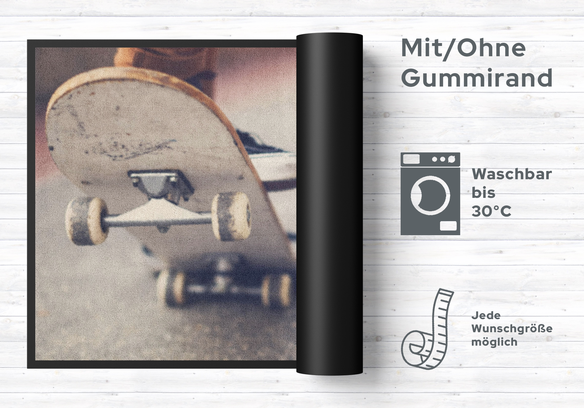 Mit dieser Fussmatte Skateboard 6083 zaubern Sie nicht nur Ihren Besuchern ein Lächeln ins Gesicht. Diese sehr hochwertige Fussmatte Skateboard 6083 ist reissfest, knitterfrei, waschbar. Da sie mit 7-8 mm Gesamthöhe sehr flach ist, passt sie unter fast jede Tür. Die Fussmatte ist Schadstoffgeprüft und für Allergiker geeignet. Sie erhalten 5 Jahre Herstellergarantie.