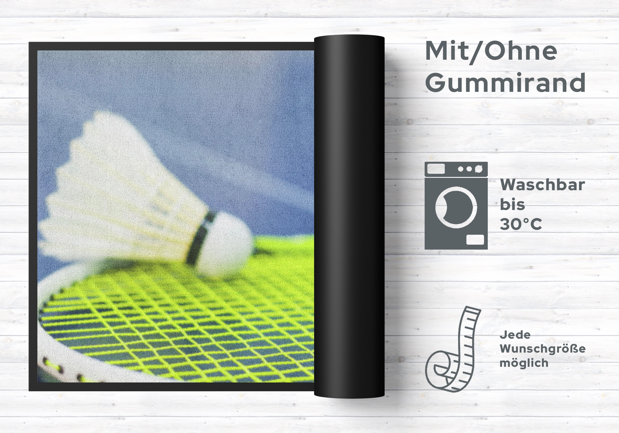 Mit dieser Fussmatte Badminton 6369 zaubern Sie nicht nur Ihren Besuchern ein Lächeln ins Gesicht. Diese sehr hochwertige Fussmatte ist reissfest, knitterfrei, waschbar. Da sie mit 7-8 mm Gesamthöhe sehr flach ist, passt sie unter fast jede Tür. Die Fussmatte ist Schadstoffgeprüft und für Allergiker geeignet. Sie erhalten 5 Jahre Herstellergarantie.