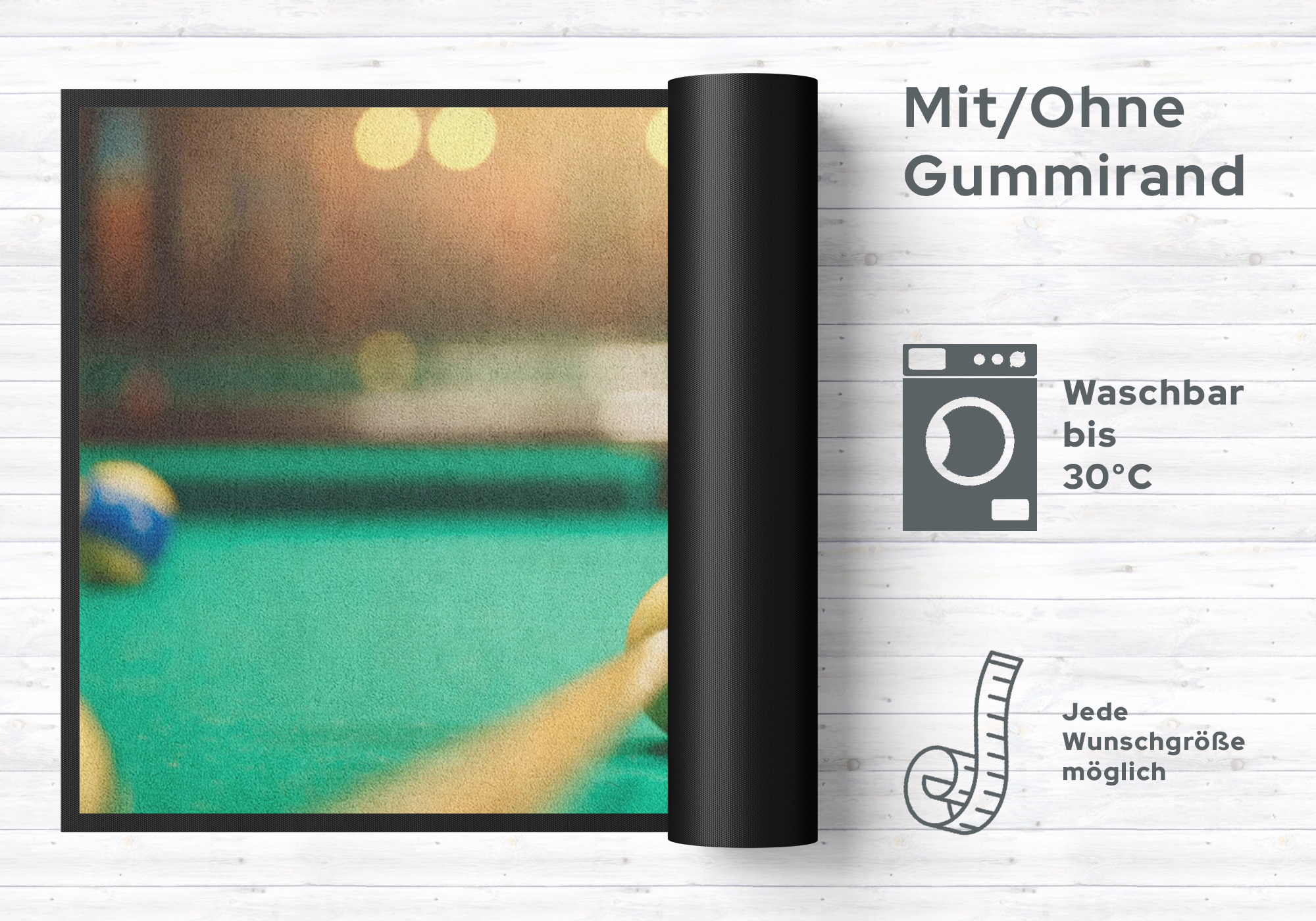 Mit dieser Fussmatte Billard 6116 zaubern Sie nicht nur Ihren Besuchern ein Lächeln ins Gesicht. Diese sehr hochwertige Fussmatte ist reissfest, knitterfrei, waschbar. Da sie mit 7-8 mm Gesamthöhe sehr flach ist, passt sie unter fast jede Tür. Die Fussmatte ist Schadstoffgeprüft und für Allergiker geeignet. Sie erhalten 5 Jahre Herstellergarantie.