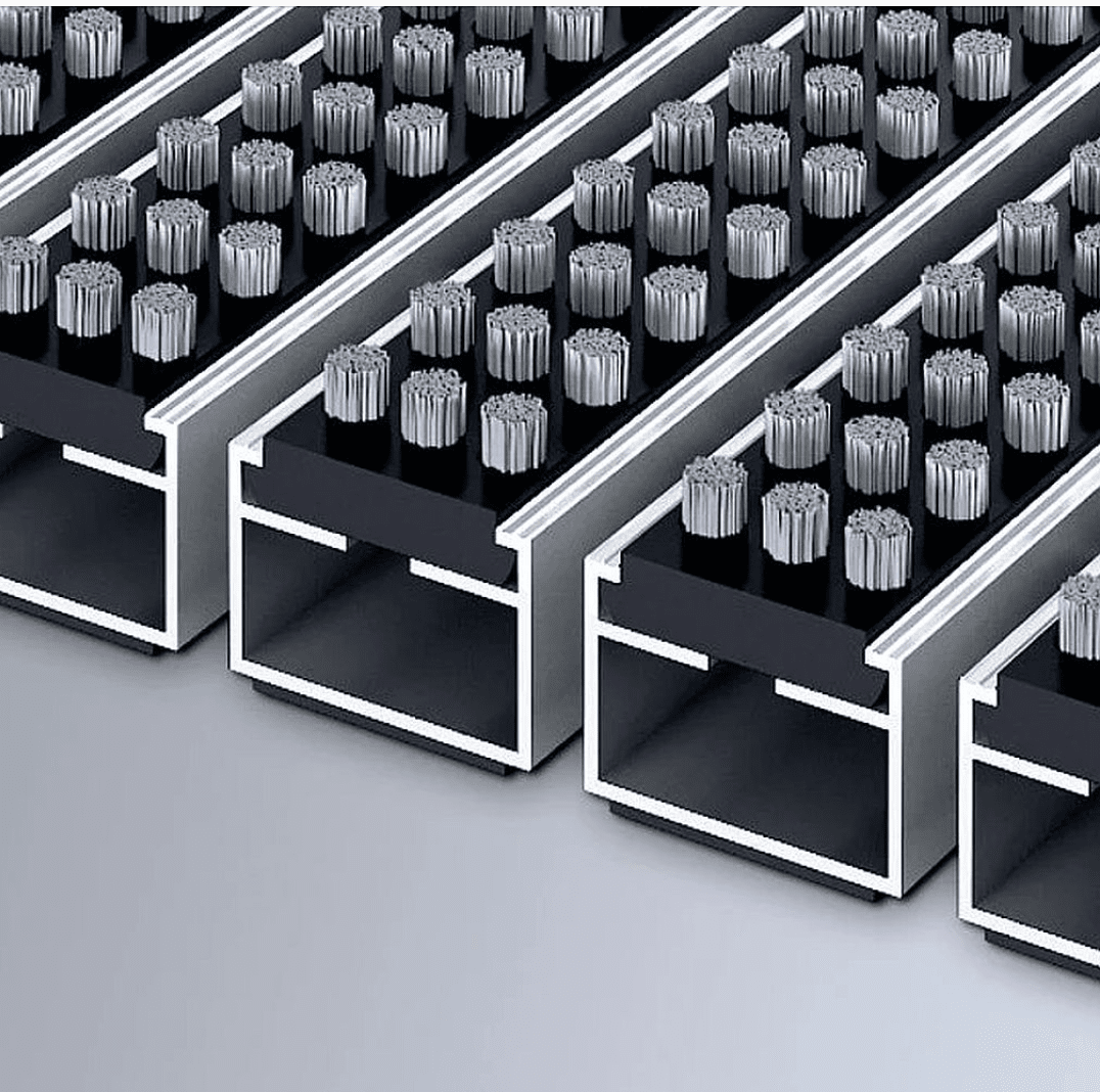 bestückt mit parallel angeordneten Borstenbündeln. Tatsächliche Mattenhöhe: + 1 bis 2 mm.