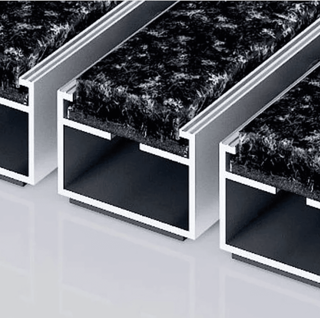 + Trägerprofil: aus verwindungssteifem Aluminium mit unterseitiger Premium-Gehschalldämmung