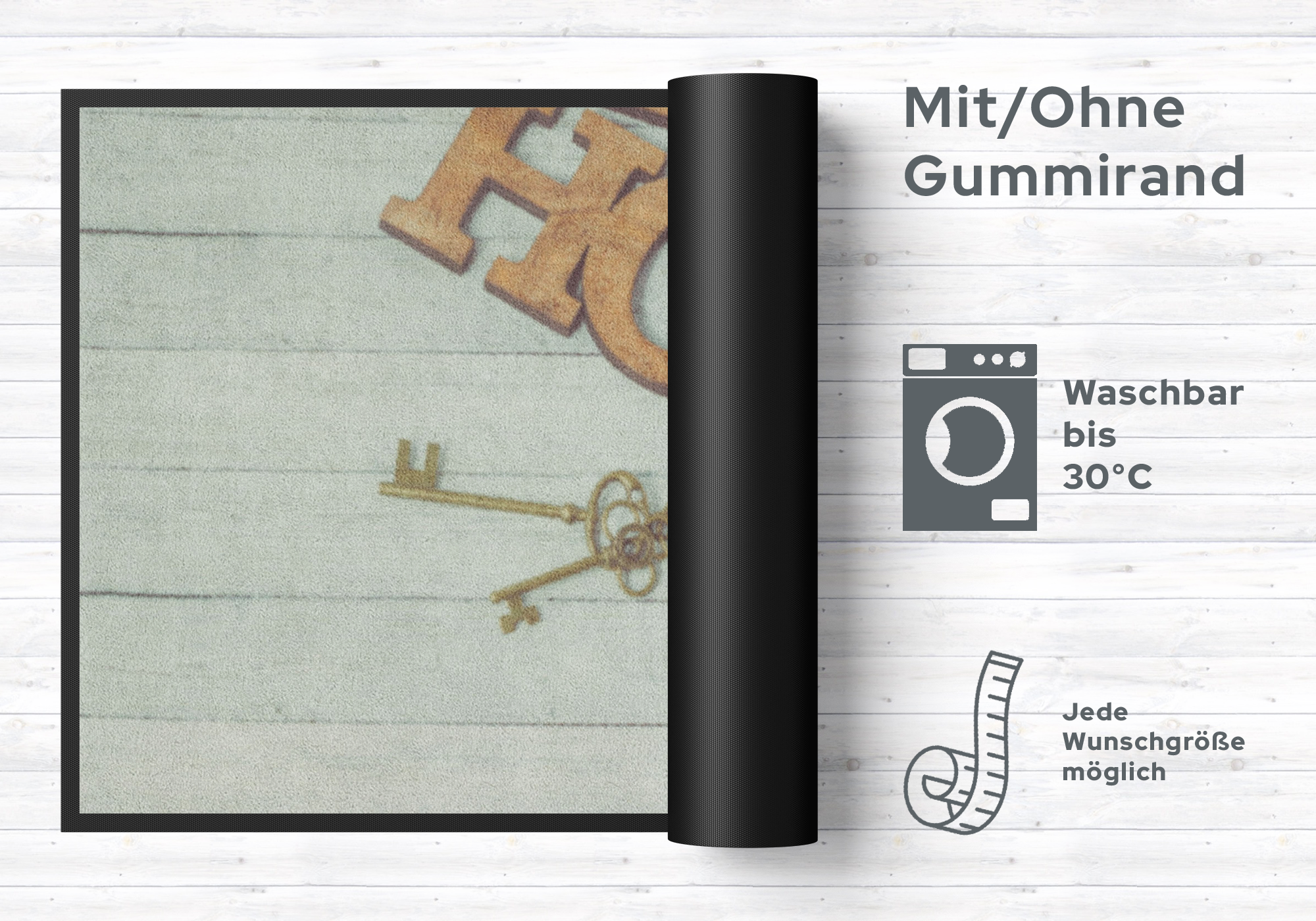 Mit dieser Fussmatte 4765 zaubern Sie nicht nur Ihren Besuchern ein Lächeln ins Gesicht. Diese sehr hochwertige Türmatte ist reissfest, knitterfrei, waschbar. Da sie mit 7 mm Gesamthöhe sehr flach ist, passt sie unter fast jede Tür. Die Fussmatte ist Schadstoffgeprüft und für Allergiker geeignet. Sie erhalten 5 Jahre Herstellergarantie.