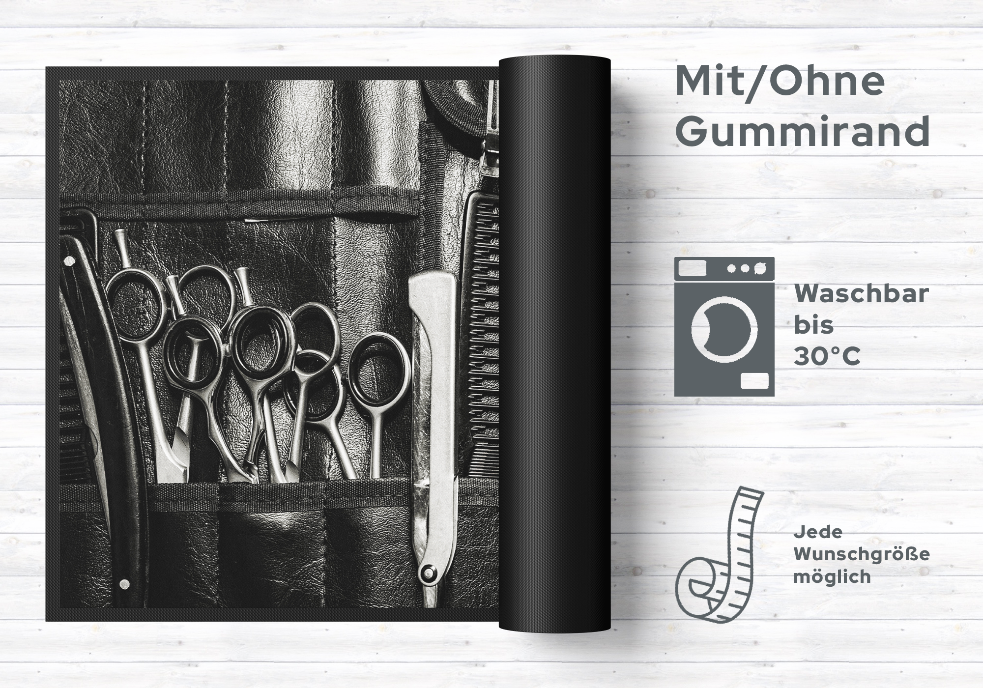 Pflegetipps: Waschen Sie die Fußmatte Frisör 10094 separat bei 40° Temperatur mit Feinwaschmittel, schleudern diese auf niedriger Stufe, dadurch richten sich die Fasern auf, der Mattenflor wird aktiviert und transportbedingte Falten und Knicke werden wieder glatt. Pflegen Sie so Ihre Fußmatte regelmäßig und Sie werden überrascht sein, wie viele Jahre Qualität und Farbe erhalten bleiben. Rückgabe ist ausgeschlossen, da es sich hier um eine individuelle Fussmatte handelt.
