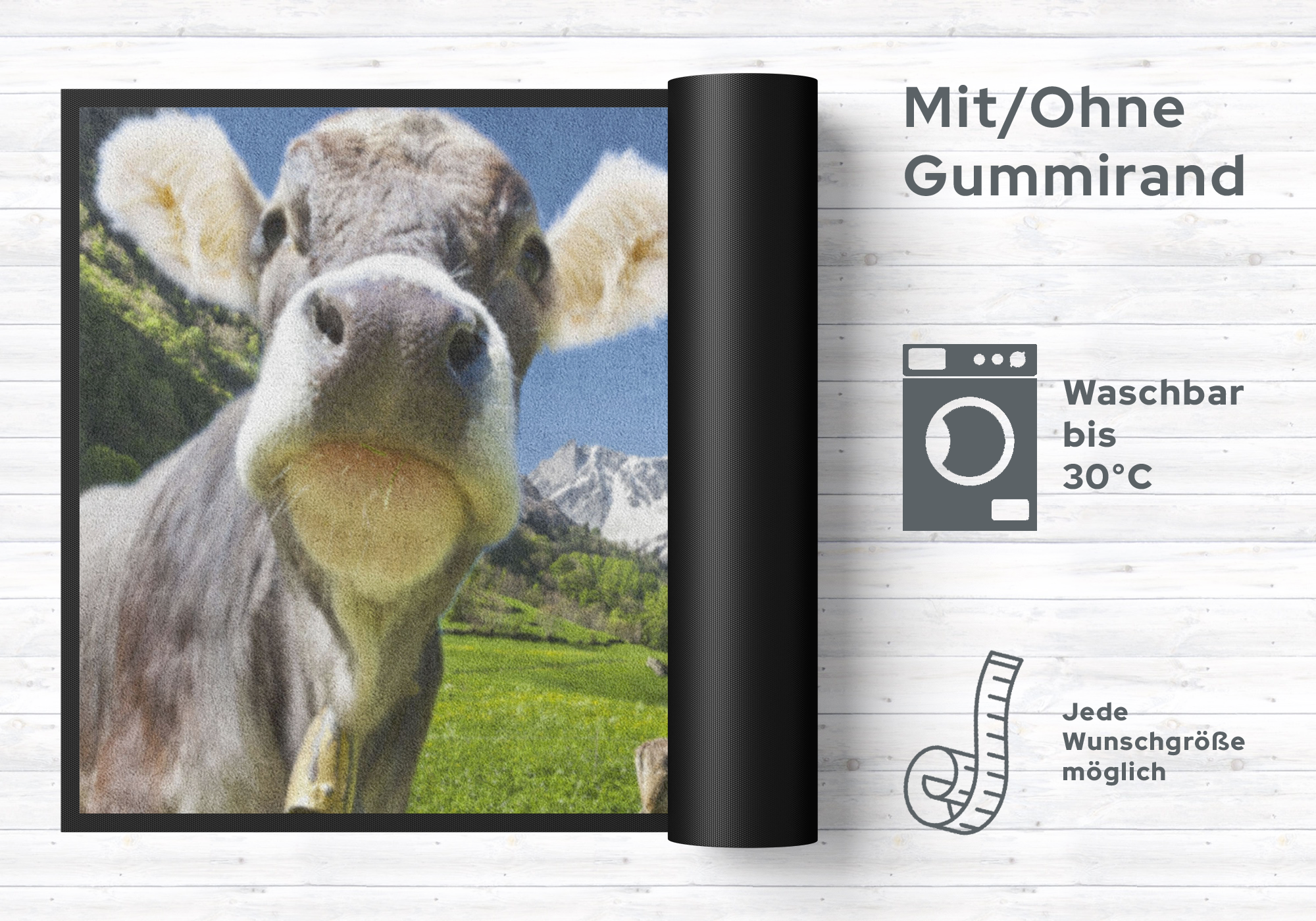 Hergestellt aus strapazierfähigem, wetterfestem Material, ist diese Fußmatte für jedes Wetter geeignet und hält deinen Eingangsbereich sauber und einladend. Die pflegeleichte Oberfläche fängt Schmutz und Feuchtigkeit zuverlässig auf, während das liebevoll gestaltete Kuhmotiv immer wieder für einen fröhlichen Empfang sorgt. Ein kleiner Hauch von Schweizer Lebensgefühl, der jeden Tag aufs Neue gute Laune macht.