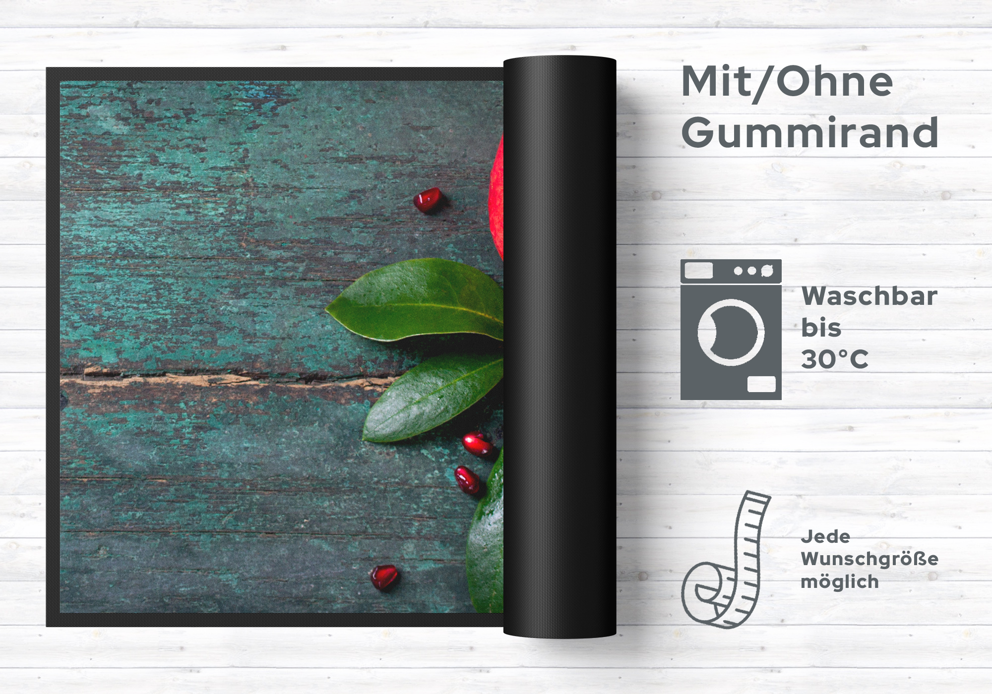Mit dieser Fußmatte Granatapfel 10102 zaubern Sie nicht nur Ihren Besuchern ein Lächeln ins Gesicht. Diese sehr hochwertige Türmatte ist reissfest, knitterfrei, waschbar. Da sie mit 7 mm Gesamthöhe sehr flach ist, passt sie unter fast jede Tür. Die Fußmatte ist Schadstoffgeprüft und für Allergiker geeignet. Sie erhalten 5 Jahre Herstellergarantie.