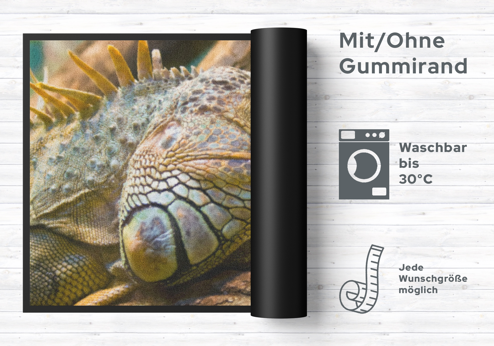 Mit dieser Fussmatte Reptil 6212 zaubern Sie nicht nur Ihren Besuchern ein Lächeln ins Gesicht. Diese sehr hochwertige Fussmatte ist reissfest, knitterfrei, waschbar. Da sie mit 7-8 mm Gesamthöhe sehr flach ist, passt sie unter fast jede Tür. Die Fussmatte ist Schadstoffgeprüft und für Allergiker geeignet. Sie erhalten 5 Jahre Herstellergarantie.