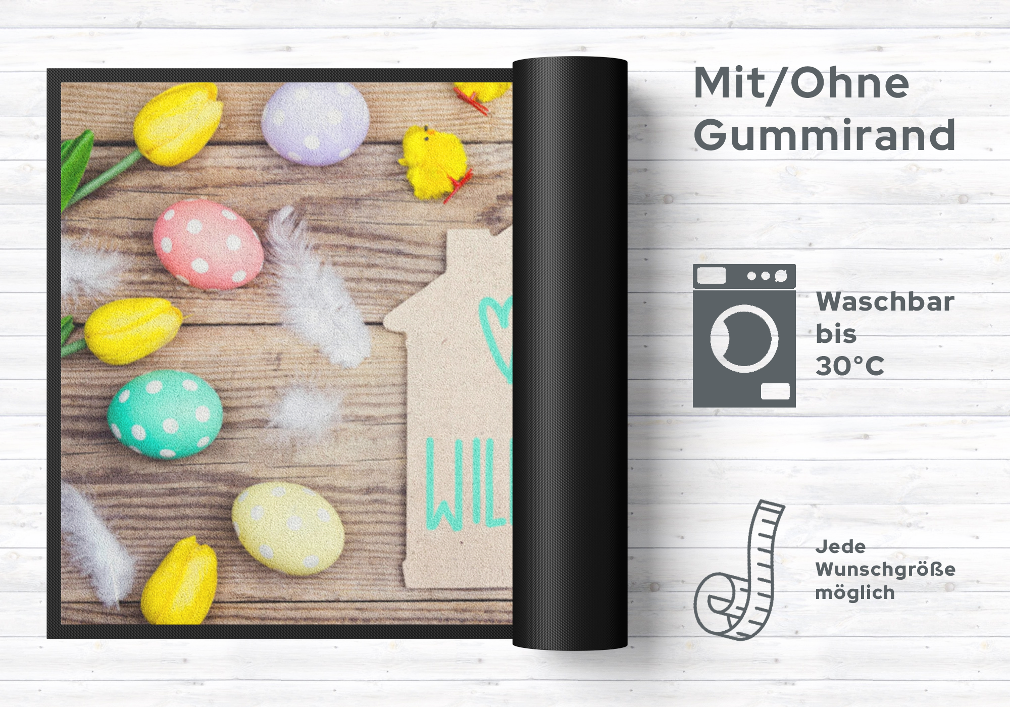 Mit dieser Fussmatte Herzlich Willkommen Ostern 10253 zaubern Sie nicht nur Ihren Besuchern ein Lächeln ins Gesicht. Diese sehr hochwertige Türmatte ist reissfest, knitterfrei, waschbar. Da sie mit 7 mm Gesamthöhe sehr flach ist, passt sie unter fast jede Tür. Die Fussmatte ist Schadstoffgeprüft und für Allergiker geeignet. Sie erhalten 5 Jahre Herstellergarantie.