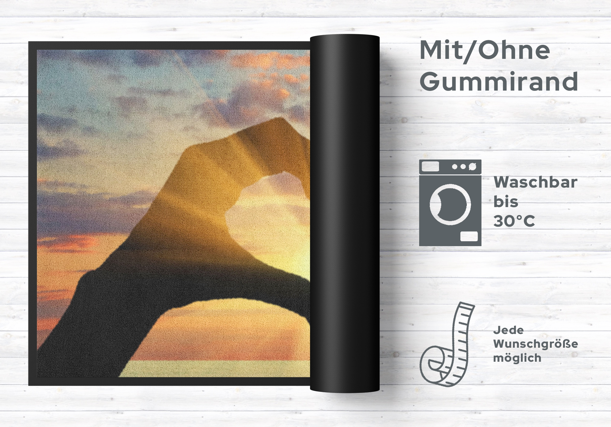Mit dieser Fussmatte Sonnenuntergang 4799 zaubern Sie nicht nur Ihren Besuchern ein Lächeln ins Gesicht. Diese sehr hochwertige Türmatte ist reissfest, knitterfrei, waschbar. Da sie mit 7 mm Gesamthöhe sehr flach ist, passt sie unter fast jede Tür. Die Fussmatte ist Schadstoffgeprüft und für Allergiker geeignet. Sie erhalten 5 Jahre Herstellergarantie.