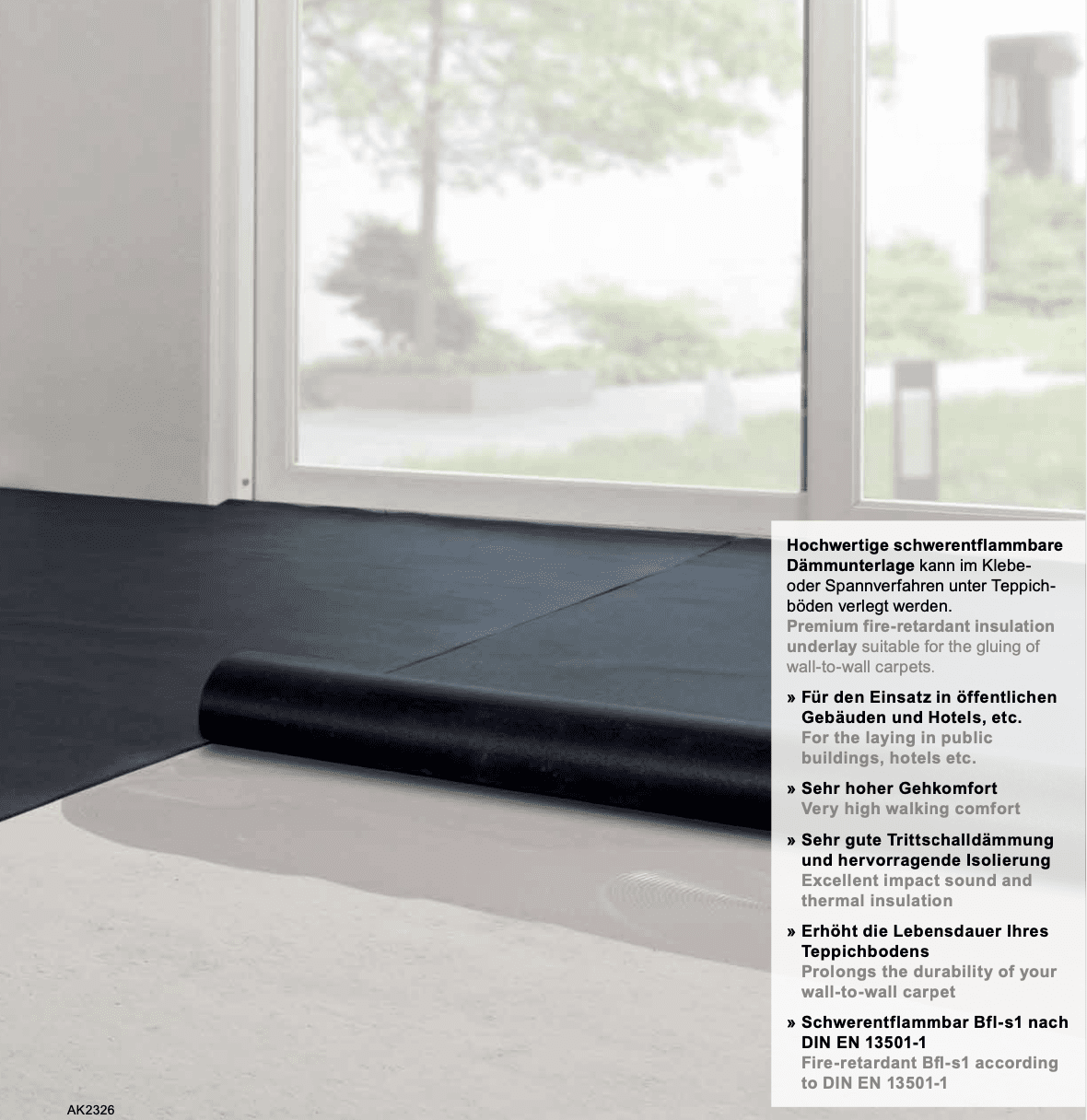 Hochwertige schwerentflammbare Dämmunterlage kann im Klebe- oder Spannverfahren unter Teppichböden verlegt werden.