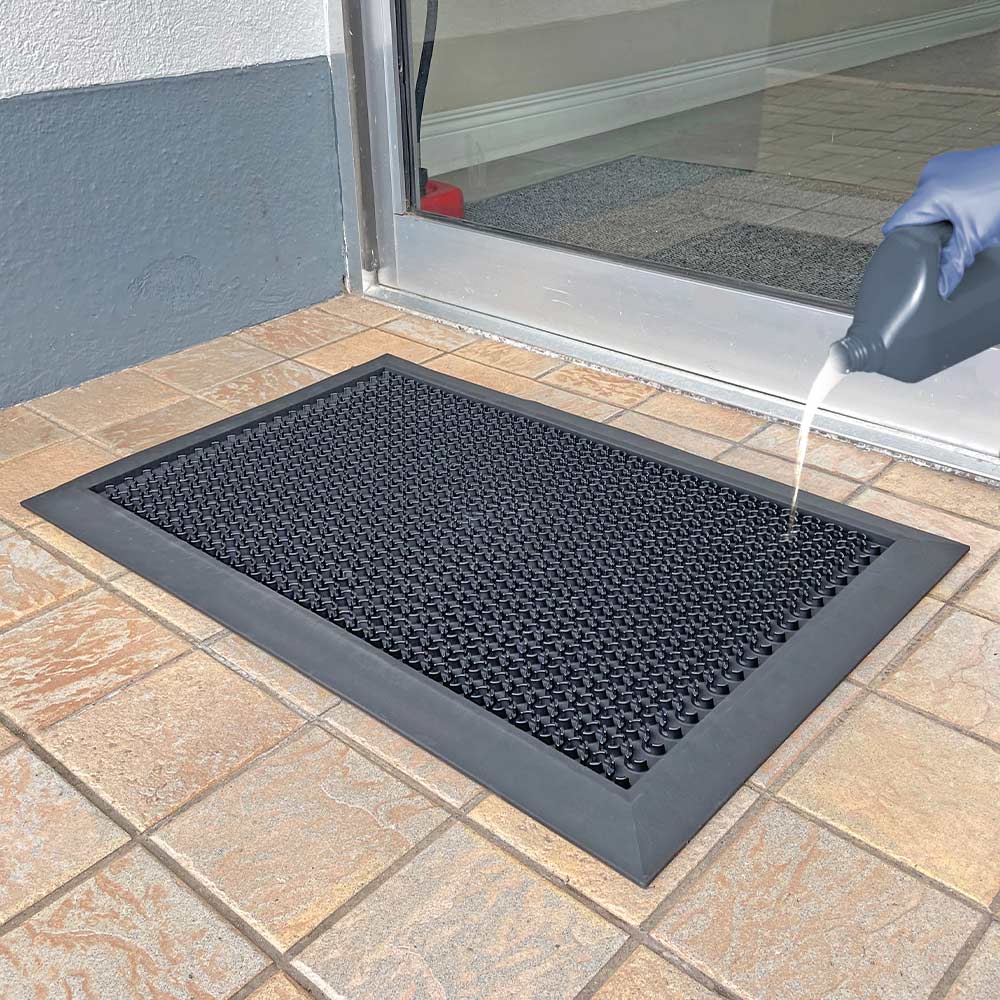 - Hält flüssiges Desinfektionsmittel zur wirksamen Reinigung von Schuhwerk an den Eingängen.