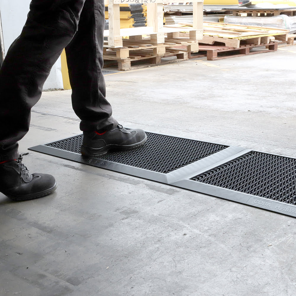 - Abgeschrägte Kanten der Desinfektionsmatte verringern die Stolpergefahr.