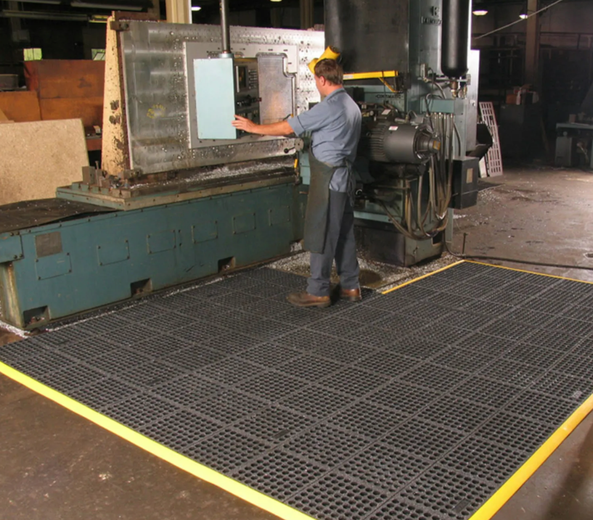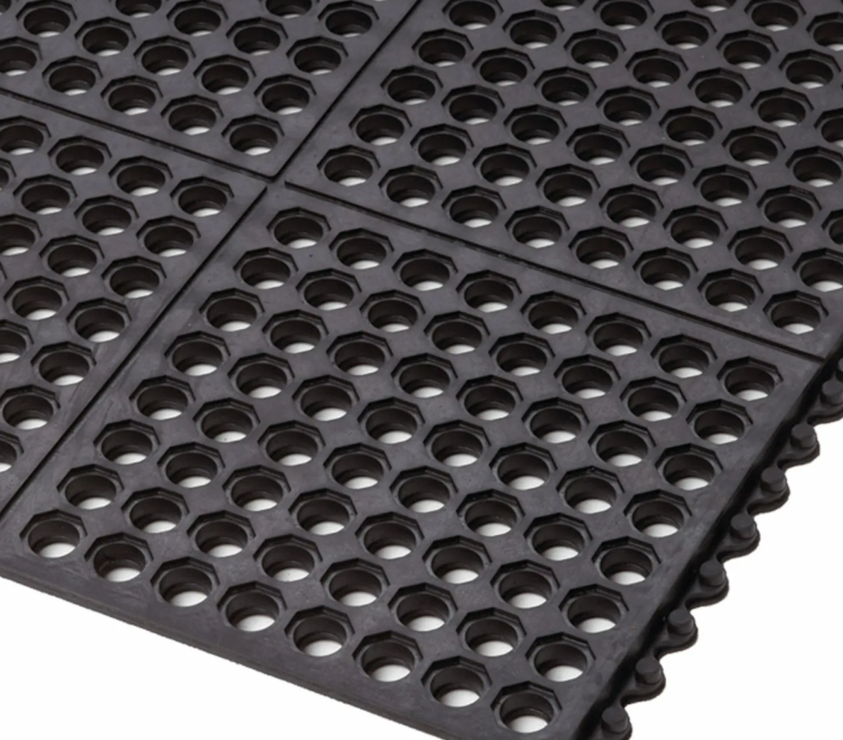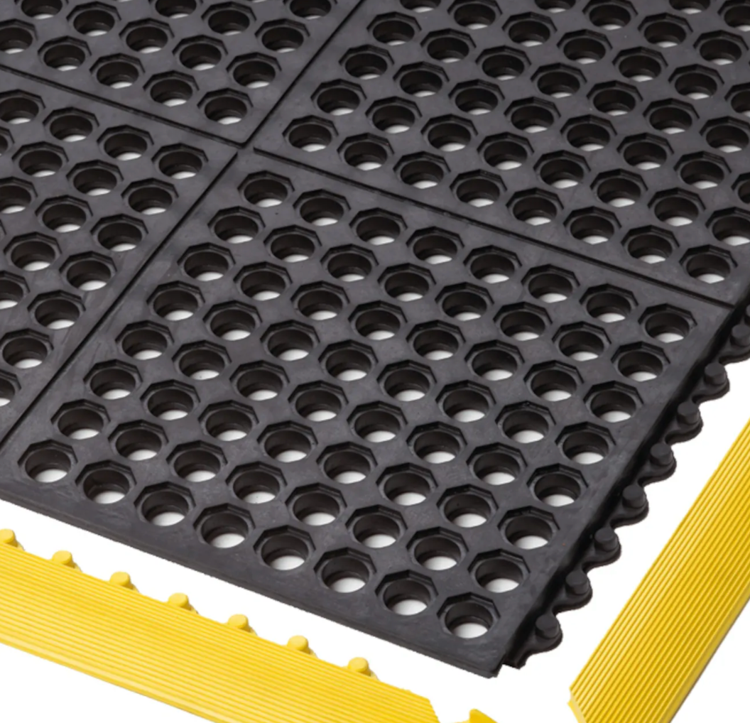 Modulare Gummi Anti-Ermüdungsmatten mit Löchern für exzellente Drainage und Belüftung hinterlassen einen trockenen und sauberen Arbeitsbereich. Dieses Stecksystem ermöglicht eine Maßanfertigung vor Ort. Quadratische Steck-Gummifliesen mit der Abmessung von 91 cm x 91 cm können mühelos verlegt werden, entweder von Wand zu Wand oder als Insellösung in allen Richtungen und vielfältigsten Formen.