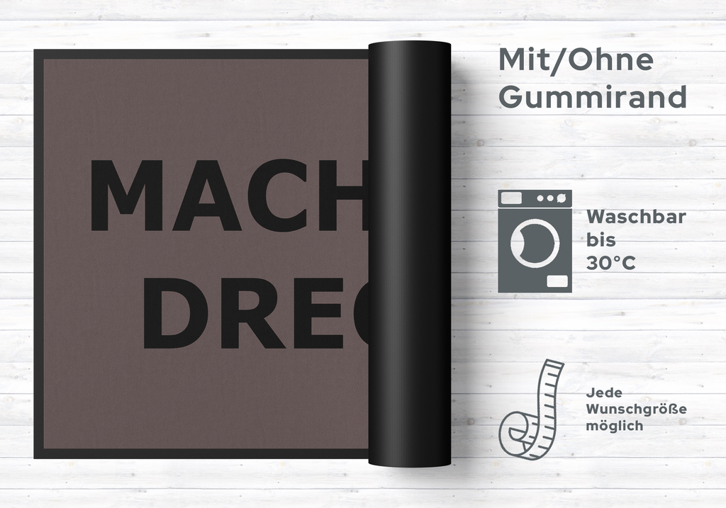 Pflegetipps: Waschen Sie die Fußmatte 10629 separat bei 40° Temperatur mit Feinwaschmittel, schleudern diese auf niedriger Stufe, dadurch richten sich die Fasern auf, der Mattenflor wird aktiviert und transportbedingte Falten und Knicke werden wieder glatt. Pflegen Sie so Ihre Fußmatte regelmäßig und Sie werden überrascht sein, wie viele Jahre Qualität und Farbe erhalten bleiben. Rückgaberecht ausgeschlossen, da es sich um eine individuelle Fussmatte handelt.