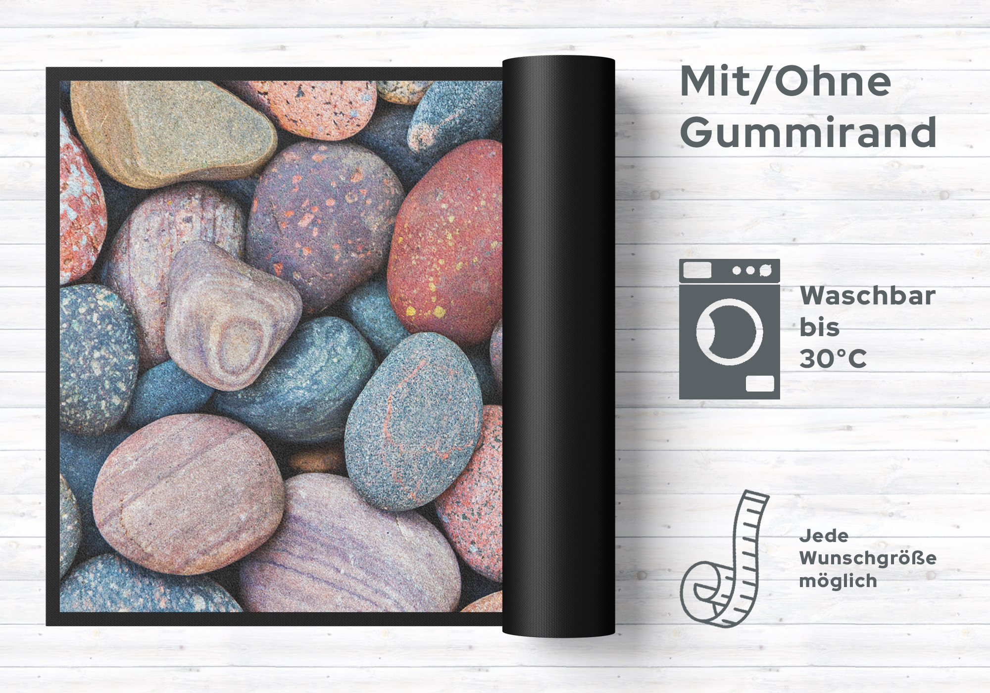 Mit dieser Fußmatte Steine 10154 zaubern Sie nicht nur Ihren Besuchern ein Lächeln ins Gesicht. Diese sehr hochwertige Türmatte ist reissfest, knitterfrei, waschbar. Da sie mit 7 mm Gesamthöhe sehr flach ist, passt sie unter fast jede Tür. Die Fußmatte ist Schadstoffgeprüft und für Allergiker geeignet. Sie erhalten 5 Jahre Herstellergarantie.
