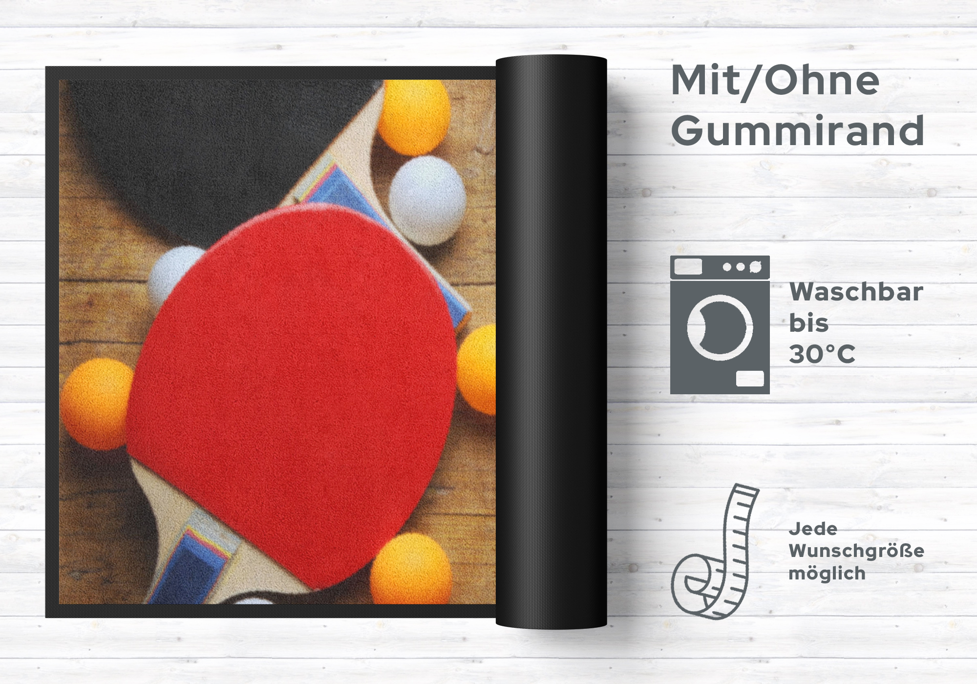 Mit dieser Fußmatte Tischtennis 4596 zaubern Sie nicht nur Ihren Besuchern ein Lächeln ins Gesicht. Diese sehr hochwertige Türmatte ist reissfest, knitterfrei, waschbar. Da sie mit 7 mm Gesamthöhe sehr flach ist, passt sie unter fast jede Tür. Die Fußmatte ist Schadstoffgeprüft und für Allergiker geeignet. Sie erhalten 5 Jahre Herstellergarantie.
